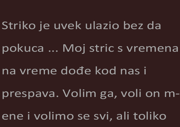 Striko je uvek ulazio bez da pokuca … Moj stric s vremena na vreme dođe kod nas i prespava. Volim ga, voli on mene i volimo se svi, ali toliko se osećam neugodno u svojoj kući zbog njega. Kao da ne mogu da se opustim. Jednom mi je ušao u sobu dok sam se pre.vlačila, a on ladno gleda kaže ju sori, trebao sam