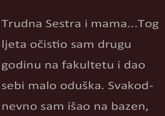 Trudna Sestra i mama…Tog ljeta očistio sam drugu godinu na fakultetu i dao sebi malo oduška. Svakodnevno sam išao na bazen, noću posjećivao kafiće, muvao se sa djevojkama, uživao. Bio je ponedjeljak , rano popodne, kad me je sestra pozvala da dođem do nje da joj nešto pomognem. Roditelji su mi spakovali…Dugo smo razgovarali uz večernju kaficu. Rajna mi je pričala o sebi, mužu, planovima,