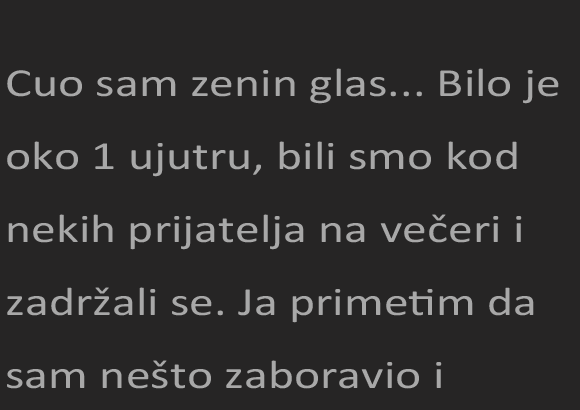 Cuo sam zenin glas… Bilo je oko 1 ujutru, bili smo kod nekih prijatelja na večeri i zadržali se. Ja primetim da sam nešto zaboravio i krenem da se vratim, dam joj ključeve od kola. Nisam razmišljao da bi moglo
