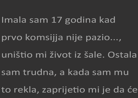 Imala sam 17 godina kad prvo komsijja nije pazio…, uništio mi život iz šale. Ostala sam trudna, a kada sam mu to rekla, zaprijetio mi je da će da me ubije ako ikome kažem. Nisam znala šta da radim, ćutala sam, a vrijeme je prolazilo. Kada su mama i tata saznali da sam trudna isto veče su me istjerali iz kuće, ODREKLI SU ME SE, bez da sam imala