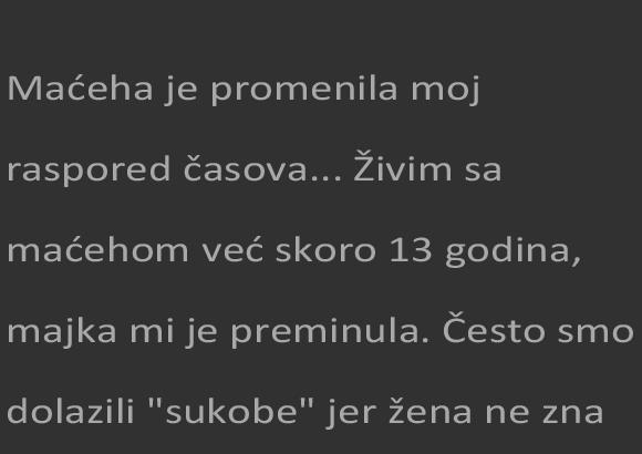 Maćeha je promenila moj raspored časova… Živim sa maćehom već skoro 13 godina, majka mi je preminula. Često smo dolazili “sukobe” jer žena ne zna voditi konverzaciju. To čak suludo zvuči u 2021. godini. Naime, ona dolazi iz patrijarhalne porodice gde samo žensko treba da radi, šuti I pri tome da kuka čitav život da je “sluga”, a muškarac ne treba ništa raditi jer je MUŠKARAC. Ja se s tim ne slažem te smatram da se poslovi u kući dele ravnopravno. Nedavno je izjavila da žrtve silooovanja izazivaju to svojim provookativniim oblačenjem i onda je svoju dušu otvorila da je dugo bez muškarca to tiho