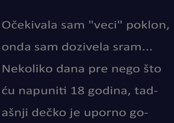 Očekivala sam “veci” poklon, onda sam dozivela sram… Nekoliko dana pre nego što ću napuniti 18 godina, tadašnji dečko je uporno govorio kako će me šokirati, biću šokirana, doživeću šok. Na dan rođendana,