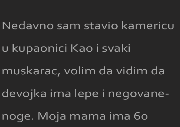 Nedavno sam stavio kamericu u kupaonici Kao i svaki muskarac, volim da vidim da devojka ima lepe i negovane noge. Moja mama ima 60 godina, i noge kao 20 ogodisnjakinja. Ja lepse noge od njenih nisam