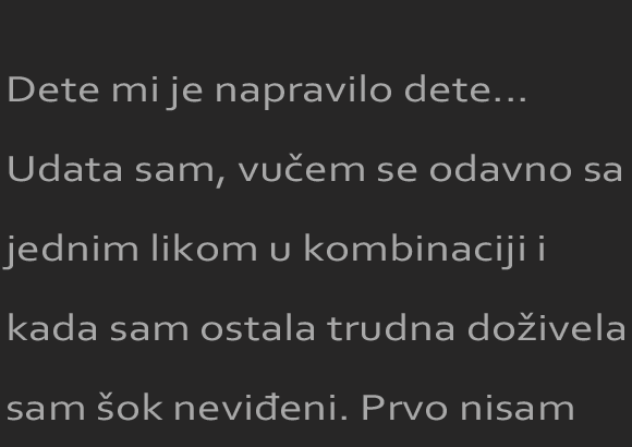 Dete mi je napravilo dete… Udata sam, vučem se odavno sa jednim likom u kombinaciji i kada sam ostala trudna doživela sam šok neviđeni. Prvo nisam spremna za trudnoću, drugo kako da kažem mužu da sam trudna sa nekim ko je namerno svr.io u mene, treće imam strah od porođaja. Muž je pre svega danima