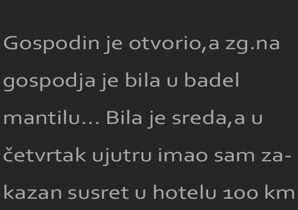 zgodnu lepu zenu,dugih lepih noga,zategnute gu.e,bujnih si.a, lepe glave,bujne plave kose. Iznenada gospodin koji je sedeo sa njom je prisao mom stolu i rekao mi. “Mi smo bracni par, a u braku smo 20 g. . Dosli smo ovde na izlet. U svom malom gradu smo vrlo smerni,poštovani,a ovde bi se malo opustili. Video sam da gutas pogledom moju zenu,pa ako hoćes dodji u nasu sobu br .21 da je je.es”. Bio sam vise nego iznenadjen. Nisam znao da li je neka sala,da li mozda hoce da me namame,pa pokradu….. Najmanje sam verovao da bas mogu sada da je.em tako zg.dnu,pa navodno ud.tu zenu tako lako. Dok sam bio zatečen gospodin mi je rekao da je sef ekspoziture jedne poznate banke,a da supruga radi kod njega,da imaju dvoje dece,dobar brak. Pozdravio me je i otisao. Dok sam mislio na neobičan susret neko me je ku.uo po ledjima. Bio je to moj poslovni prijatelj koji se nekim svojim poslom nasao u istom hotelu to vece. Pod utiskom onoga sto mi se desilo ispričao sam mu o neobičnom susretu mislivsi da se pozdravim sa njim i odem da odmaram u svojoj sobi uz TV. Me djutim on mi je rekao odmah da treba da idemo kod njih u