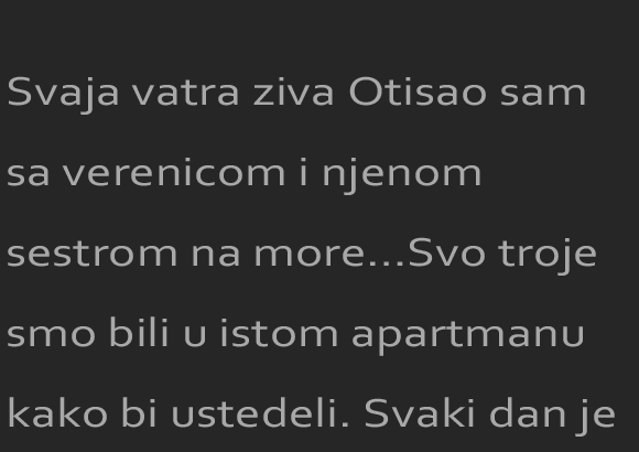Svaja vatra ziva Otisao sam sa verenicom i njenom sestrom na more…Svo troje smo bili u istom apartmanu kako bi ustedeli. Svaki dan je moja verenica isla u kupovinu dok smo njena mladja sestra i ja
