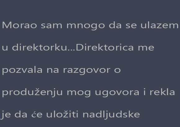 Morao sam mnogo da se ulazem u direktorku…Direktorica me pozvala na razgovor o produženju mog ugovora i rekla je da će uložiti nadljudske napore da se to desi, ako spavam snjom posle posla jer kaze da sutra ide na sastanak i odmah moze da sredi za ugovor. Ja sam to odbio. Kad sam tu priču pričao djevojci