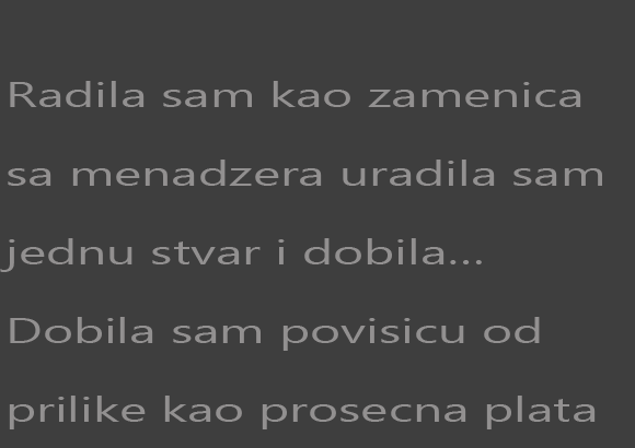 Radila sam kao zamenica sa menadzera uradila sam jednu stvar i dobila… Dobila sam povisicu od prilike kao prosecna plata u Srbiji i bolje radno mesto posle 5 godina, radila sam sve za svoju korist. Naime, pocinila sam prevaru vikendom sam radila kao zamenica sa menadzera i na kraju radnog vremena ostavila