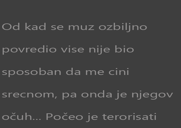 Od kad se muz ozbiljno povredio vise nije bio sposoban da me cini srecnom, pa onda je njegov očuh… Počeo je terorisati porodicu za sitnice (tipa, malo nije pocisceno u kuhinji, počne razbijati pola kuće), od mene zahtevati nenormalne stvari u krevetu, perv..zijama lečiti svoju impotenciju. Nije me z..ovoljio kao ženu godinama, samo nasrće kao prase, odurio mi je odnose. Sina koji je u pubertetu zna istući, a sin je pukao pa mu često vrati. Totalno sam nemoćna. Ne mogu se rastati jer bih izgubila kucu, a nemam nikoga