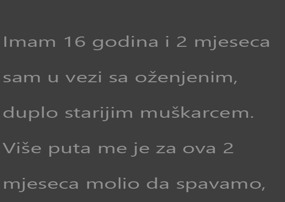 Imam 16 godina i 2 mjeseca sam u vezi sa oženjenim, duplo starijim muškarcem. Više puta me je za ova 2 mjeseca molio da spavamo, ali ja sam željela da nevinost sačuvam za prvu bračnu noć i svaki puta sam ga odbijala. Sinoć mi je rekao da nema smisla da čekamo da se on razvede, pa da se mi vjenčamo, skunuo je sa svog prsta burmu, kleknu na koljena i zaprosio me tom burmom. Toliko sam bila oduševljena da sam pristala,