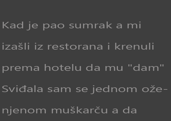 Sviđala sam se jednom oženjenom muškarču a da nisam znala da je oženjen i bilo mi svejedno, i izašli smo na večeru. Kad je pao sumrak a mi izašli iz restorana i krenuli prema hotelu da mu “dam” jer bio je uporan da odemo u hotel, na ulici smo videli jednu veoma bledu baku buljavih plavih očiju, obučenu u crninu. Imala je veoma starinski šešir na glavi kao iz devetnaestog veka i kišobran kojim se poštapala. Išla