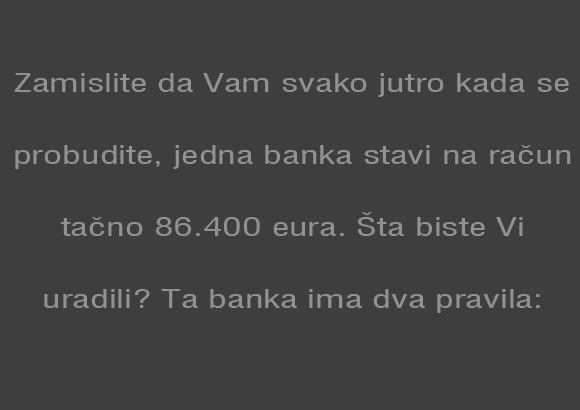 Zamislite da Vam svako jutro kada se probudite, jedna banka stavi na račun tačno 86.400 eura. Šta biste Vi uradili? Ta banka ima dva pravila: Prvo pravilo glasi: Sve što niste… Read more »