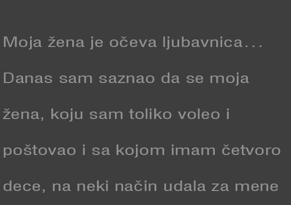 Moja žena je očeva ljubavnica… Danas sam saznao da se moja žena, koju sam toliko voleo i poštovao i sa kojom imam četvoro dece, na neki način udala za mene… Read more »