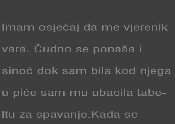 Imam osjećaj da me vjerenik vara. Čudno se ponaša i sinoć dok sam bila kod njega u piće sam mu ubacila tabeltu za spavanje.Kada se uspavao ušla sam mu na… Read more »