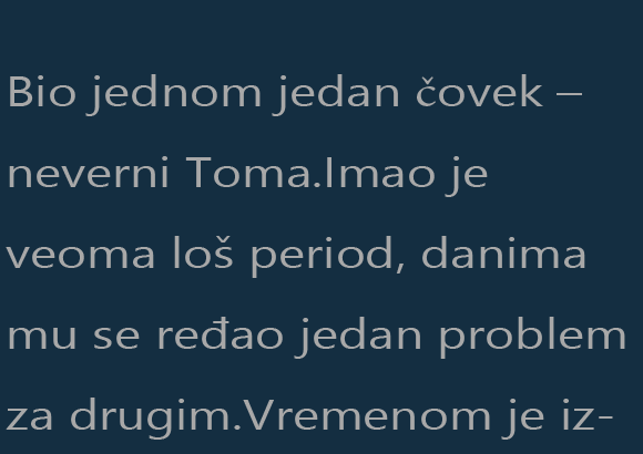 Bio jednom jedan čovek – neverni Toma. Imao je veoma loš period, danima mu se ređao jedan problem za drugim. Vremenom je izgubio veru da će biti bolje i počeo… Read more »