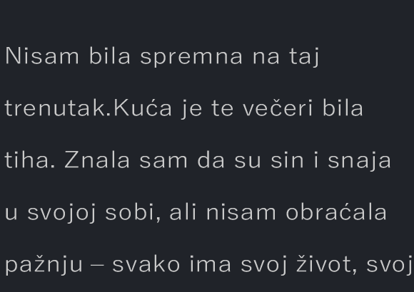 Nisam bila spremna na taj trenutak. Kuća je te večeri bila tiha. Znala sam da su sin i snaja u svojoj sobi, ali nisam obraćala pažnju – svako ima svoj… Read more »